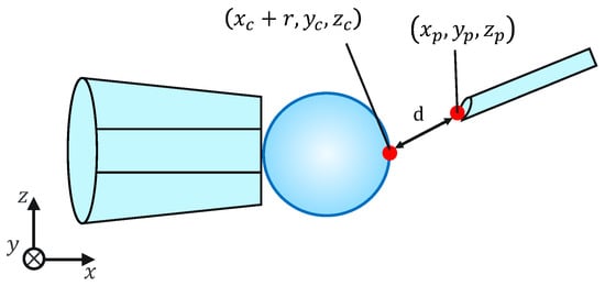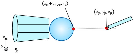 where and are the scale factors () for the cell and holding pipette with noncontact and contact, respectively, and is the unit vector in the grasping direction of the haptic device. The contact judgment is made using the coordinates of the holding pipette, grasping angle, and circle detection of the cell. The holding pipette coordinates, grasping angle, and cell circle detection are determined through image processing, as outlined in []. The acquisition of the pipette coordinates obtained from the coordinate transformation has a delay of approximately several milliseconds and may deviate from the actual pipette coordinates. Therefore, a contact judgment method that considers slight deviations in the pipette position must be developed. Specifically, when the following inequality is satisfied, the holding pipette is considered to be in contact with the cell.