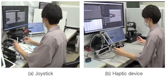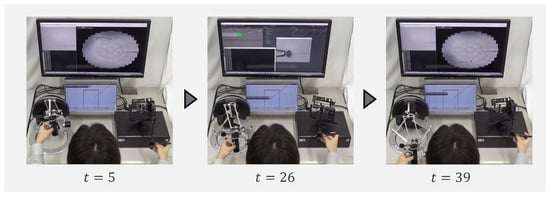 Note that , , , , , , and r are obtained from the image processing and the movement of the micromanipulator based on the work []. The switching of the presentation image was performed via the keypad. The images were switched using a keyboard operation or by pressing a physical button on the haptic device used to control the injection pipette. The experimental setup is shown in Figure 12.