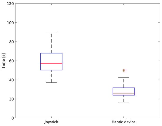 The experiment comprised a two-condition task for six subjects. Because the distribution of the results was not expected to be normal, a nonparametric Wilcoxon signed-rank test was used. The test results showed that the p values were significantly different for the task performance time and accuracy. The task performance time was reduced by an average of 52.6% by changing the control device from a joystick to a haptic device. The largest decrease was observed in C at 62.0% and the smallest decrease was observed in E at 43.2%. The task performance time decreased significantly regardless of the subject. The significant decrease in the task performance time can be attributed to the change from the joystick to the haptic device for both pipette manipulations.