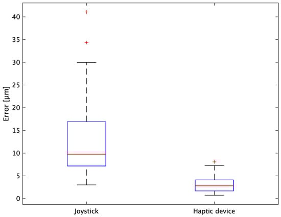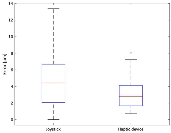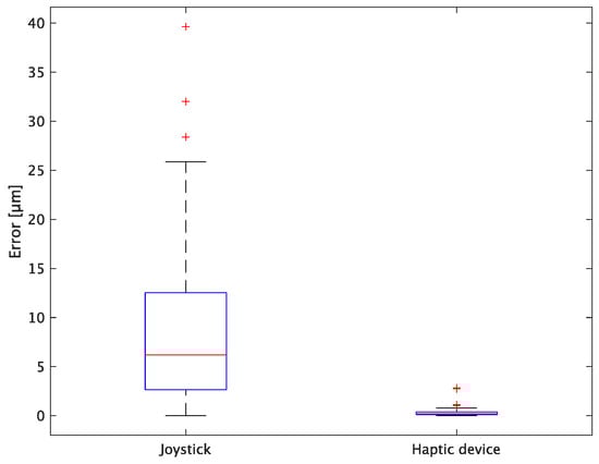 The experimental results are as follows: Table 2 presents the average task performance times under conditions (a) and (b) for each subject, Table 3 presents the error during the injection, and Table 4, Table 5 and Table 6 show the average errors along the x, y, and z axes, respectively. Further, Table 3, Table 4, Table 5 and Table 6 show the average errors along the x, y, and z axes, respectively. Figure 13 shows a box-and-whisker diagram of the task execution time. Moreover, Figure 14 shows a box-and-whisker diagram of the error, and Figure 15, Figure 16 and Figure 17 show the box-and-whisker diagrams of the errors along the x, y, and z axes, respectively. The x, y, and z axes represent box plots of the error in each direction.