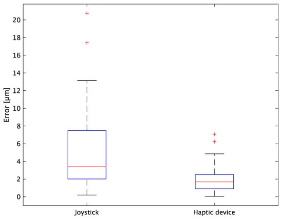 In terms of accuracy, the error d was reduced by an average of 75.3% by changing the operating device from a joystick to a haptic device. The largest percentage decrease was 85.9% for D, and the smallest percentage decrease was 54.7% for A. Those with a larger percentage decrease in the task time tended to exhibit a smaller percentage decrease in errors, whereas those with a smaller percentage decrease in task time tended to exhibit a larger percentage decrease in error. This smaller error is attributed to the manipulation device of the injection pipette. The injection pipette has an assist function that fixes the direction of injection, allowing the user to concentrate only on the x axis after alignment, thus enabling a highly accurate injection. Furthermore, by checking the errors along the x, y, and z axes, the x component of the error d was reduced by an average of 61.7%. The largest decrease was observed in A (81.6%), and the smallest in B (20.2%). The y component decreased by an average of 59.6%. The y component decreased by an average of 59.6%, with F having the largest decrease of 81.6% and A having the smallest decrease, increasing the error by 50.5%. The z component decreased by an average of 96.0%. The largest decrease was observed in B (98.7%), and the smallest decrease was observed in F (91.3%). The error in the x axis is considered to be smaller because the subject can concentrate on the x-axis manipulation, as described above, even in the absence of a guiding function. Owing to the lack of a guide function, the rate of reduction varied significantly from subject to subject. The y and z axes were improved using the guide function. The z axis was more difficult to confirm visually than the x and y axes’ coordinates simultaneously. The guide function allows the injection pipette to be aligned with the cell in the same line. However, there is a slight delay between the command and the actual movement of the pipette tip. During this delay, the position of the cell changes slightly, causing the error in the y axis and z axis to deviate from zero. The haptic device is a three-dimensional manipulation interface. However, excessive degrees of freedom can reduce usability depending on the task. For instance, it may be necessary to limit the movement of one axis when working on a two-dimensional plane. Nevertheless, the proposed system was effective in simplifying the manipulation of ICSI because the task performance time and error were clearly reduced using the proposed system in all subjects.