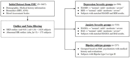 In this study, a physiological dataset of 3687 patients collected from the Samsung Medical Center (SMC) was used to perform mood disorder diagnosis and subtype classification. These are heart rate variability test data from patients aged 20 to 60 years who were conducted from 1 January 2016 to 15 June 2022 at the depression center in the department of psychiatry. The data of each subject, including the physiological dataset, includes demographic information, HRV indices, medical history, and assessment scale results including the Hamilton Depression Rating Scale (HAMD), Hamilton Anxiety Rating Scale (HAMA), Beck Depression Inventory (BDI), Beck Anxiety Inventory (BAI), Mood Disorder Questionnaire (MDQ), and Hypomania Symptom Checklist-32 (HCL-32). When selecting the data, heart diseases such as arrhythmia and heart failure, and heart disease-related procedures such as artificial heartbeat insertion high-frequency electrode catheter resection, or thoracic surgery were excluded. The data used in this study were selected and used for analysis using previously recorded data not newly collected data for research. All processes were carried out under Institutional Review Board (IRB) approval.