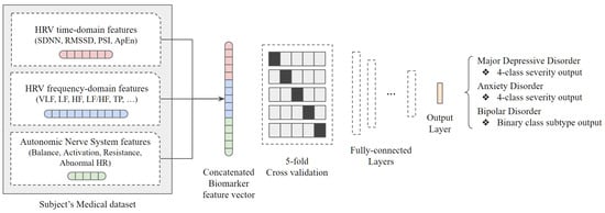 According to the statistical significance test under p-value of 0.05, there are only two significant variables in the severity group comparison of MDD, zero significant variables in the comparison of AD, and five significant variables in the subtype comparison of BP. In other words, it can be seen that the limitations of the statistical approach are clear for severity or disease subtype recognition beyond simple disease classification. This is because although it is possible to accurately classify the group only when there is a clear difference in the core data variables of HRV representing the autonomic nerve system, there is an insignificant difference in the variables when looking at the results of statistical analysis. Therefore, we adopted the deep neural network algorithm under the assumption that data variables without statistical significance would have hidden features to help classify severity or subtype. The overall system of the proposed architecture is shown in Figure 2.