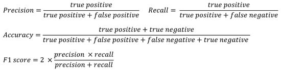 In this study, four indicators were used to confirm the performance of the experimental results as shown in Figure 3: precision, recall, accuracy, and F1 score. These are indicators that are widely used in diagnostic research, and it is possible to compare the predicted results with the actual results and also evaluate the validity of the model. For the three different classification tasks covered in the study, a classification model was generated as described above, and the result of analyzing the test dataset using this is shown as a confusion matrix. Using the corresponding results, it is possible to calculate the precision, recall, accuracy, and F1 score indicators for performance confirmation.