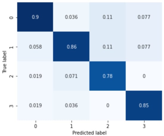 First, the results for MDD among the mood disorder severity classification tasks are shown in Figure 4. The labels 0, 1, 2, and 3 of the confusion matrix represent normal, mild, moderate, and severe depressive disorder groups. The analysis results for the four severity categories of major depressive disorder are 0.8833 of the average classification accuracy, 0.8862 precision score, 0.8833 recall score, and 0.8840 F1-score.