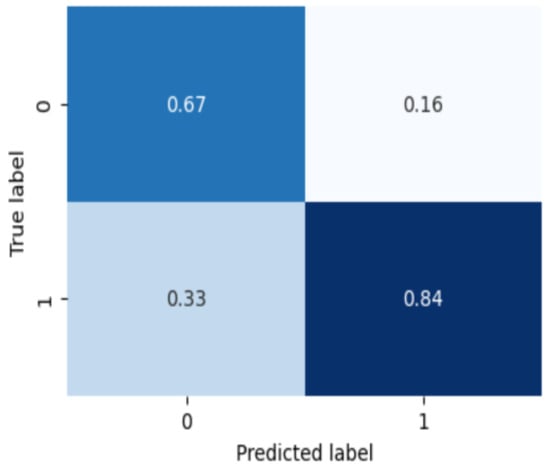 Finally, Figure 6 is the classification result of what subtype is in the group diagnosed as bipolar disorder. On the confusion matrix, 0 is type 1 bipolar disorder and 1 is type 2 bipolar disorder. The binary classification for the bipolar disorder subtype classification results are 0.8333 of the average classification accuracy, 0.7666 of the precision score, 0.8333 of the recall score, and 0.7976 of the F1 score, respectively. The bipolar disorder subtype classification shows relatively lower performance than the severity classification for the other two mood disorders, which is confirmed as a result of less data and severe imbalance between subtypes compared to other tasks.