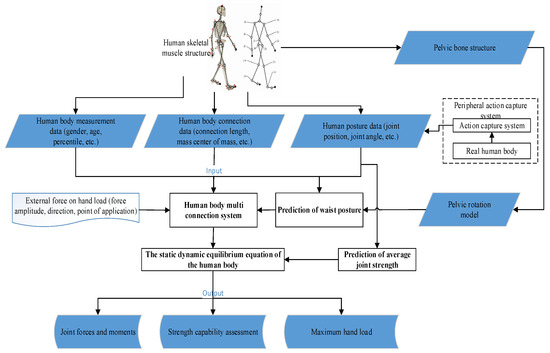 Ergonomics is an engineering and technical discipline that analyzes the impact of factors such as work environment and methods on human psychology, physiology, and other aspects by studying the operation of human–machine environment systems [1,2]. Virtual human efficiency analysis technology uses virtual humans instead of real workers [3,4] to conduct ergonomic analysis on workers. Due to its advantages such as low cost and reusability, biomechanical modeling technology based on virtual humans has rapidly developed with computer technology.