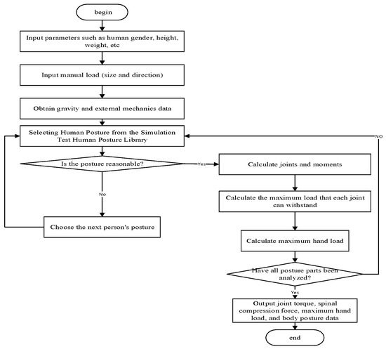 The calculation process of the whole-body static mechanics model is shown in Figure 2, which mainly includes the following steps. The first step is to input human body data such as gender, height, and weight; Step 2: input the hand load; Step 3: input other external mechanical data including gravity; Step 4: input the human posture data collected by the motion capture system to determine whether the posture is reasonable (whether it is achievable, whether it exceeds the limits of each joint of the human body). If it is reasonable, calculate the mechanical data at each joint and the maximum hand load corresponding to that posture. If it is unreasonable, choose the next human posture. Finally, check if all the postures included in the posture database have been analyzed. If not, select the next human posture and repeat the fourth step. If yes, output the relevant prediction data and end.