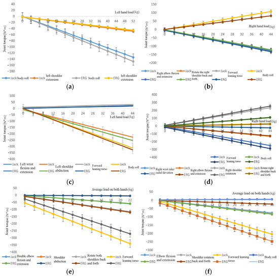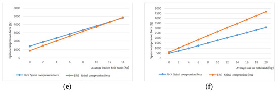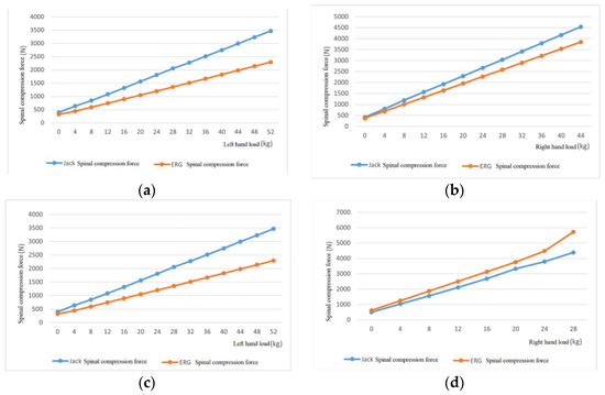 As the hand load increases, the joint torque error in the same direction output by the two software gradually increases, and the overall error increase is relatively small. When the hand load exceeds a certain level, the relative error of the predicted spinal compression force output by ERG is smaller than that of Jack’s predicted value. The spinal compression force value output by ERG is more accurate than Jack’s.