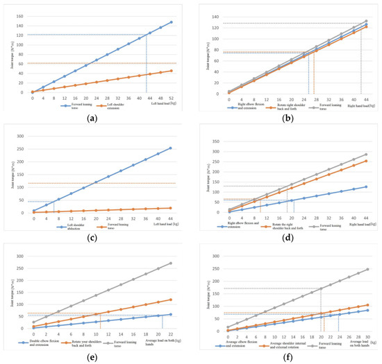 (1) The reliability verification of the model in this article selected the industrial-specific human–machine ergonomics software Jack for output comparison. The verification of joint torque, spinal compression force, and average joint strength all showed that the model in this study has considerable effectiveness, but there are still some system errors or calculation deviations. In future work, the calculation accuracy of the model can be further improved.