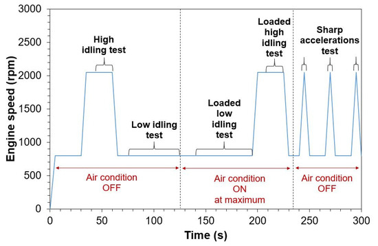 Vehicles were fueled with market gasoline [63] and were tested with hot engines, meaning with engine coolant temperature > 70 °C. The SPN measurement devices registered data during the entire test. Figure 2 illustrates an example of the test procedure. The first 30 s after the ignition of the thermal engine was considered a stabilization period. Afterward, five different test procedures were conducted: low and loaded low idling, high (2000–3000 rpm) and loaded high idling, and finally three sharp accelerations reaching up to 2000 and 3000 rpm. The load was created by activating the air conditioning system of the vehicles at maximum. The tests were performed at the subsequent sequence: high idling, low idling, loaded low idling, loaded high idling, and sharp accelerations. The total duration of the full sequence from the engine ignition was 300 s. For each test, only a portion was taken into consideration when determining the average SPN concentration. Specifically, the first 10 to 15 s were considered as stabilization time periods (e.g., when accelerating from low idling to ~2000 rpm), and the rest was used for determining the average SPN emissions for each test. For the ‘sharp accelerations’ tests, the maximum SPN for each acceleration was recorded. It should be recalled that the protocol for diesel engines includes a 15 s stabilization period and at least a 15 s measurement at low idling.