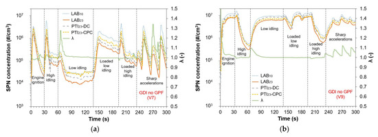 Particle number concentrations and lambda values during testing at high, low, loaded low, loaded high idling, and sharp accelerations with a stationary vehicle for two gasoline direct injection (GDI) vehicles without gasoline particulate filters (GPFs): (a) V7; (b) V9.