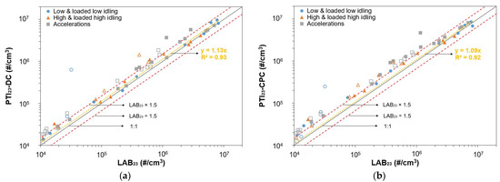 Figure 4 shows the PN emission measurements of the fifteen vehicles listed in Table 1, as obtained with PTI23-DC (Figure 4a) and PTI23-CPC (Figure 4b), plotted against LAB23. For each vehicle, 3 points are included (low and loaded low idle, high and loaded high idle, accelerations) with a total of 57 points. Only concentrations in the range 104–107 #/cm3 are presented and fitted to ensure that concentrations are well within the measurement range of the PTI instruments. Vehicles V1 to V4 emitted in all tests PN concentrations lower than 104 #/cm3 and are not included. GDI vehicles are represented with markers with solid fill and PFI vehicles without fill. The dotted yellow line represents a linear fit of the entire dataset (all three subsets) with an intercept of zero. The black line shows a 1:1 PTI device and LAB23 relation, while the red lines serve as a visual guide, representing 1.5 times the LAB23 value and LAB23 divided by 1.5.