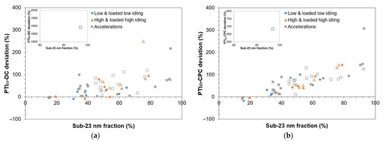 In this subsection, we investigate the effect of sub-23 nm particle fractions on PTI instrument discrepancies. The sub-23 nm fraction is defined as (LAB10 − LAB23)/LAB10. Figure 5a plots the PTI23-DC deviation, which is defined as (PTI23-DC − LAB23)/LAB23, against the sub-23 nm fraction. Figure 5b similarly plots the PTI23-CPC deviation. With solid fill symbols, we plot GDI vehicles and without fill symbols PFI vehicles. In most cases, the sub-23 nm fraction was greater than or equal to 30%, corresponding to geometric mean diameters (GMDs) less than or equal to 35 nm, assuming a unimodal particle size distribution with σg ~1.7 [64]. PFI vehicles emitted more sub-23 nm particles compared to GDI vehicles, with an average fraction of 60% for PFI vehicles and 47% for GDI vehicles. Furthermore, among various tests, we observed varying sub-23 nm fractions. GDI vehicles at low idling emitted on average sub-23 nm fraction of 38%, while at high rpm (i.e., at high, loaded high idling and at sharp accelerations) the fraction was 51%. It was not possible to evaluate whether these high concentrations of particles in the range of 10–23 nm emitted during the PN-PTI tests occur also at type approval testing. Note that diesel vehicles emit high sub-23 nm particle concentrations at low idling but no proportionality with type approval was found [14].