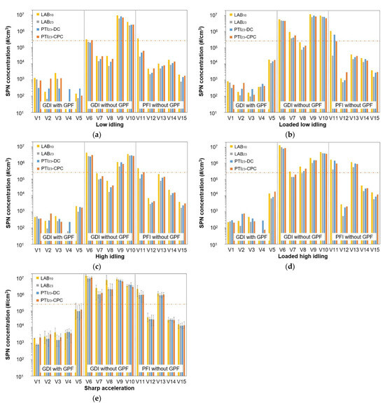 Figure 6 summarizes the SPN concentrations emitted by the 15 tested vehicles. Figure 6a plots the low idling results, Figure 6b the loaded low idling, Figure 6c the high idling, Figure 6d the loaded high idling, and Figure 6e the average of the peak SPN emissions during the three sharp accelerations. The horizontal dotted red line indicates the current PN-PTI limit of 250,000 #/cm3 proposed in the Commission guidelines for diesel vehicles. The two vertical solid black lines divide each figure into three parts: the first on the left shows the test results for GDI vehicles with GPFs, the second for GDI vehicles without GPFs, and the third for PFI vehicles. In Figure 6e, we present the average of the three sharp accelerations and the bars indicate the highest and lowest registered concentration values.