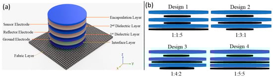 (a) The layout of the designed sensor. (b) The structure of the four sensor designs and ratio combinations of the sensor, reflector, and ground electrode.