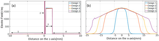 (a) The computed vertical electric field is (1) below the ground electrode, (2) between the ground and reflector electrode (has a high electric field which reaches up to 75,000 v/m due to a thin dielectric layer), (3) between the sensor and phantom (design 1: vertical electrical field peak is 50 v/m higher than the rest of the design), and (4) within the phantom (the phantom is a glass cylinder of 80 mm diameter set to a dielectric constant of 5 with a glass wall thickness of 2.5 mm and filled with water having dielectric constant of 80). (b) The computed horizontal electric field distribution across the four sensor designs.
