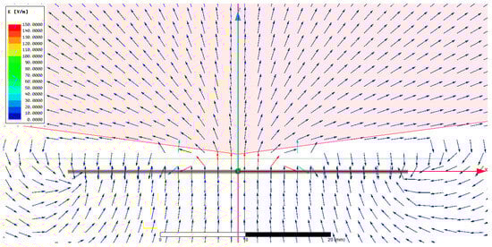 In order to compute different designs’ vertical and horizontal electric fields, the sensor is located in a 3D simulating environment plan at x = 0 mm, y = 0 mm, and z = 1 mm, as shown in the block diagram in Figure 2, while moving the phantom on the z-axis at values such as z = 1, 5, 10, 15, 20, and 25 mm. The analysis of Figure 3b shows that design 4 exhibited a more dispersed electric field distribution within objects placed parallel to the sensor during simulations, with a reduced electric field travelling vertically. In contrast, design 1 demonstrated a more focused electric field in the vertical direction and limited spread in the horizontal directions, resulting in a more directional field toward the object. Furthermore, the aim is to direct the electric fields toward the object as much as possible. Therefore, significant efforts were made by simulating and analysing different ratio combinations of three electrodes. The simulated study suggests that, by setting a ratio of 1:3:1, the electrical field of the sensor electrode is directed toward the object at the maximum and has minimal fringing field effect between the sensor and ground electrode, as shown in Figure 4. To evaluate the sensitivity to changes in object permittivity, three phantoms made of gel, acetone, and water were modelled and positioned in close proximity to the sensor in each design.