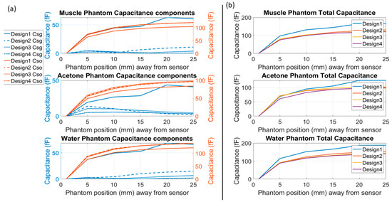 Simulation capacitance results were obtained with 3 phantoms: muscle, acetone, and water. (a) shows the capacitance of each design between the sensor and ground electrodes, which is referred to as Csg and given a blue colour along with its scale on the left side of each graph. The capacitance between the sensor and the object is referred to as Cso, which is given an orange colour along with its orange scales on the right side of each graph. (b) shows each design’s total capacitance toward the phantom.