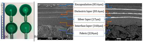 For this study, a white woven polyester/cotton fabric with a composition of 50% polyester and 50% cotton was selected as the substrate [25,26]. A 1-inch area of the chosen fabric was observed under a digital microscope and found to have a thread count of 4940, with an ends per inch (EPI) of 76 and a picks per inch (PPI) of 65. Additionally, polyester/cotton fabric is compositionally similar to the fabric used in hospitals’ personal protective equipment (PPE) and in patient gowns and is thus the most suitable for the intended application in this study [18]. This fabric was chosen because of its smooth surface, which was measured using a digital microscope with 3D scanning capability. A 0.1 cm radius circular area of the used fabric was examined under a digital microscope for surface roughness, which measured 119.24 μm. This roughness is likely to damage or cause discontinuities in the 10 μm thin silver ink-based electrodes. Therefore, the fabrication process begins with screen printing of a UV-curable dielectric ink/layer to act as an interface layer, which is cured in a UV conveyor for 20 s. The dielectric ink has a viscosity of 12,000 Cp and a dielectric constant of 3. This layer provides a smooth surface for the subsequent printing of the silver layer. The silver ink is ElectraPolymers Ronascreen 1300 Series Flexible Coverlay. As elaborated above, a 0.1 cm radius circular area of the interface layer was examined under a digital microscope and it was found that the surface roughness was reduced to 59.37 μm, although this is not as smooth as a standard polymer printing substrate, such as DuPontTM Kapton® [27], which has a surface roughness of 23 μm. High connectivity was observed with a 1.5Ω resistance between two distant points (distance = 3 cm) after depositing the silver layer which was cured in an oven at 110 °C for 10 min. The printing process involves repeatedly printing the dielectric layer and the conductive layer until all three electrodes and dielectric layers are completed. Figure 6a shows the printed sensors in four sensor designs made using this technique. Design 1 was examined using a scatter electron microscope to validate the continuity, positioning, and thickness of each layer, as shown in Figure 6b.