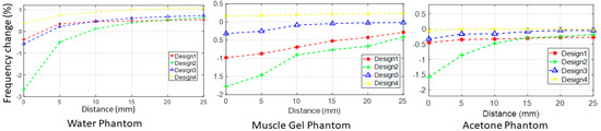 The percentage frequency change (%f-c) of four designs in response to the three different phantoms is presented in Figure 8. The %f-c due to the presence of three phantoms (water, acetone, and gel) at a distance of 0.1 mm can be summed up to obtain the cumulative %f-c, as listed in Table 3. According to Equation (4) and Figure 8, design 2 yields the maximum cumulative percent frequency changes of 6.2%f-c. In Equation (4), ‘D’ stands for design, ‘C’ stands for cumulative, ‘W’ represents water phantom, ‘G’ represents gel phantom, and ‘A’ represents acetone.