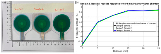 Furthermore, the screen-printing reference marks help in repeatability and producing identical sensors of the same design, as shown in Figure 9a. Design 2’s three identical replicas from three different batches (shown in Figure 9a as Sample 1, Sample 2, and Sample 3) were selected for a repeatability test and their %f-c toward water phantom was tested. Figure 9b shows that identical sensors of the same design do produce a similar %f-c., which makes it evident that the proposed screen-printing mechanism and the sensor do have repeatability capability.