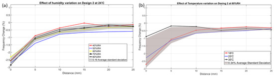 (a) Humidity variations ranging from 40% to 80% RH at 24 °C cause an average standard deviation of 0.19 in the design 2 response. (b) Temperature variations ranging from 18 °C to 35 °C at 60% relative humidity (RH) impact the response of design 2, resulting in an average standard deviation of 0.34.