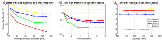 Flexing durability tests were conducted to assess and evaluate the sensor’s resilience to flexing durability. To perform the flexing durability test, the sensor was tapped on pipes of different sizes (with diameters ranging from 25 mm to 110 mm); the flexing durability setup is given in Supplementary Data (S3-a). To avoid pressure artefacts, the sensor was placed above the pipes. Although the test was performed with pipe diameters ranging from 25 mm to 110 mm, in a realistic scenario, it is highly unlikely for the sensor to be bent over a diameter of 25 mm. Therefore, the flexing durability region of interest is considered to be from 60 mm to 110 mm, the most likely flexing durability range. Design 1 exhibits the highest sensitivity (0.8%f-c) to flexing durability; it is not desirable because the ideal sensor would have minimal sensitivity to flexing durability. The flexing durability impact on each design is shown in Figure 11a and recorded in Table 4.