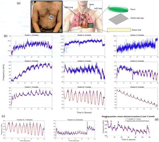 The sensor detected ten peaks at position 4, which is in line with the subject’s breathing rate of ten breaths per minute (an arrowhead is also placed in the graphs to point out the counting peaks). This position covers the lungs, and the sensor is capable of accurately capturing lung expansion and contraction during breathing, resulting in precise nulls and peaks. Additionally, outlier data points were present in the raw data, but they were removed by applying a low-pass filter. At positions 5 and 6, the sensor detected 11 and 12 peaks, respectively, corresponding to inhaling 11 and 12 breaths per minute. However, the raw data signal contained numerous outlier data points, which were likely the result of heartbeats captured by the sensor, since the heart is also located at positions 5 and 6. The experiments continued at positions 7, 8, and 9 of the test subject’s torso, as depicted in Figure 12a.