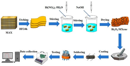 A total of 20 mg of Bi2O3/Ti3C2Tx nanocomposites was added to an appropriate amount of absolute ethanol, and the mixture was sonicated for 2 min until the composite material was sufficiently dissolved. Then, it was uniformly coated in thickness to Al2O3 ceramic tubes with Au electrodes. The dried ceramic tube, which had been vacuum dried at 80 °C for 6 h, was welded to the base correspondingly. After that, the prepared sensor was aged for 6 h using a WS-30B gas-sensitive element test system (Zhengzhou Wensen Electronic Technology Co., Ltd., Zhengzhou, China) to ensure its stability and reliability. As shown in Figure 1, the gas-sensitive performance experiments of the aged sensor were performed at room temperature (25 °C) by WS-30B. Additionally, pure Bi2O3-based and Ti3C2Tx-based sensors were tested using the same methodology for comparison, respectively.