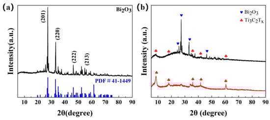 (a) XRD patterns of Bi2O3. (b) XRD patterns of Ti3C2Tx MXene and Bi2O3/Ti3C2Tx nanocomposites.