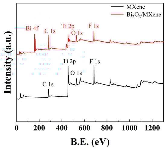 Full survey XPS spectrum of Ti3C2Tx MXene and Bi2O3/Ti3C2Tx nanocomposites.