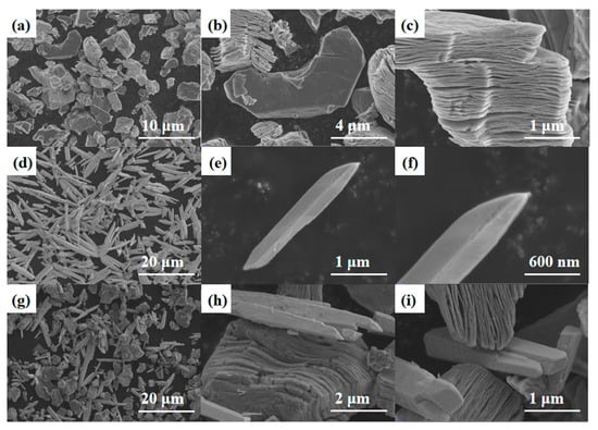 (a–c) SEM images of Ti3C2Tx MXene. (d–f) Pure Bi2O3 needle. (g–i) SEM images of Bi2O3/Ti3C2Tx nanocomposites.