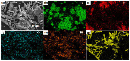 As shown in Figure 6, the element distribution state was tested using an energy spectrometer integrated with the SEM. The Ti, C, O, F, and Bi elements can be observed in the composite material. In this context, the oxygen (O) element is partly derived from the surface -O and -OH functional groups, while the fluorine (F) element originates from the -F functional group on the surface of MXene. These findings align with previous XPS analysis results, mutually verifying the conclusions. The correspondence between the bismuth (Bi) and oxygen (O) elements further confirms the successful synthesis of Bi2O3.