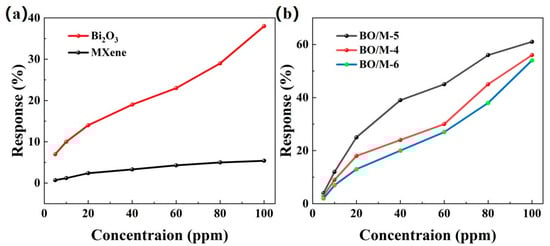 To evaluate the gas sensing performance of the prepared composite material sensors, a comparative experiment was conducted with pure Bi2O3 and Ti3C2Tx gas sensors to clarify their performance advantages. The response curves of different loading ratios to various concentrations of ammonia were tested at room temperature, and their response values were calculated. As shown in Figure 7, all the prepared gas sensors exhibited increasing response values with the increase in ammonia concentration. Figure 7a shows that the response values of pure Ti3C2Tx and pure Bi2O3 sensors from 5 ppm to 100 ppm ammonia were relatively lower than those of the Bi2O3 and Ti3C2Tx doped sensors, with pure Ti3C2Tx and Bi2O3 sensors showing responses of 5.4% and 38% at room temperature, respectively. Figure 7b shows that among the three different loading ratio sensors, the response value in the same testing environment was in the order of BO/M-5 > BO/M-4 > BO/M-6, with BO/M-5 (5:1) showing the highest response value, reaching 61% at room temperature. The BO/M-5 gas sensor’s response value was 11.3 times higher than that of Ti3C2Tx and 1.6 times higher than Bi2O3, demonstrating the effectiveness of doping. Hence, the BO/M-5 gas sensor is used for subsequent testing.