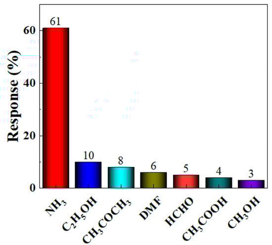 Based on the optimal loading ratio, further in-depth research on the gas sensitivity characteristics of the BO/M-5 gas sensor with the optimal loading ratio is established. Selectivity measures the sensor’s ability to distinguish between different interfering gases at a specific concentration. To test the interference resistance of the BO/M-5 gas sensor, gases such as 100 ppm ammonia, acetone, ethanol, DMF, formaldehyde, acetic acid, and methanol were tested at room temperature, and their response values were calculated. Figure 8 shows that the BO/M-5 gas sensor had a significantly higher response to 100 ppm ammonia compared to other gases, demonstrating its excellent selectivity and sensitivity to ammonia (see Figure S1 in Supplementary Materials for detail). The sensor’s response to ammonia reached 61%, while responses to other gases were all below 10%. The response of the BO/M-5 sensor to ammonia was 6.1–20 times higher than to other gases, indicating excellent selectivity for ammonia.