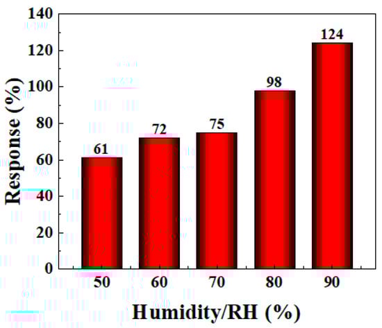 The gas sensitivity performance of most gas sensors can be affected by different humidity conditions, and the detection environment often varies in practical applications. Therefore, it is very important to further study the sensor’s gas sensitivity performance under different humidity conditions. In the experiment, to simulate the effect of different humidity environments on the gas sensor’s performance, deionized water was added to the evaporation stage of the WS-30B gas sensor testing instrument and rapidly evaporated using a heating device to increase the humidity level in the test chamber. An external humidity meter was used to monitor the humidity in the closed chamber to achieve the target humidity. As shown in Figure 9, the gas sensitivity of the BO/M-5 sensor improved with increasing humidity (see Figure S2 in Supplementary Materials for detail). The response value reached 124% at 90% humidity, proving that the sensor can adapt to complex humidity environments and even exhibit enhanced gas sensitivity in high-humidity conditions, which is beneficial for ammonia detection in subsequent applications.