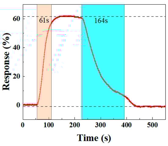 An ideal gas sensor should have rapid response and recovery times to quickly detect the target gas and allow sufficient time for further processing. Thus, response and recovery times are crucial for evaluating sensor performance. Based on the definitions of Equation (1), the BO/M-5 sensor’s response time to 100 ppm ammonia is 61 s, while the recovery time is 164 s, as shown in Figure 10. The sensor’s resistance quickly drops upon NH3 injection for 55 s (red area in Figure 10), and after NH3 is removed at 230 s (blue area in Figure 10), the resistance starts to increase until it returns to its original state. These results show that the sensor performs well in both response and recovery times, supporting its potential for further applications.