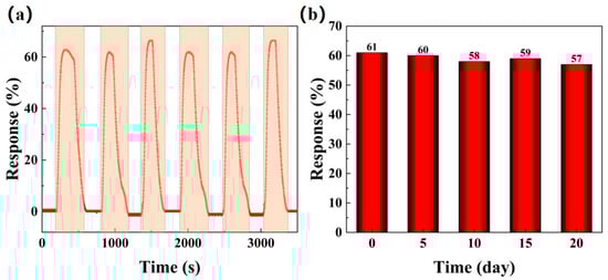 For long-term use, gas sensors must exhibit good repeatability and stability to ensure consistent performance. Figure 11 investigates the repeatability and long-term stability of the BO/M-5 sensor with 100 ppm ammonia under natural conditions. When exposed repeatedly to 100 ppm ammonia at room temperature, the sensor showed consistent response values with minimal variation, as shown by the red line in Figure 11a. Additionally, the BO/M-5 sensor demonstrated excellent long-term stability in practical applications, with response values remaining stable over a 20-day period with tests conducted every five days, as shown in Figure 11b.