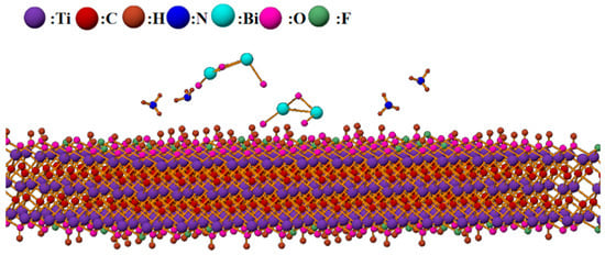 Ti3C2Tx was prepared by removing the Al layer of the MAX phase (Jilin 11 Technology Co., Ltd., Jilin, China). Bismuth nitrate pentahydrate (AR, 99%) was purchased from McLean Biochemical (Shanghai Technology Co., Ltd., Shanghai, China). HF aqueous solution (AR, ≥40%), Ammonia aqueous (AR), and Sodium Hydroxide (ACS, K ≤ 0.02%, ≥97.0% (T), Falkes) were obtained from Shanghai Aladdin Biochemical Technology Co., Ltd., Shanghai, China. Anhydrous ethanol, formaldehyde, acetone, dimethylformamide, methanol, and glacial acetic acid were purchased from Sinopharm Chemical Reagent Co., Ltd., Shanghai, China.
