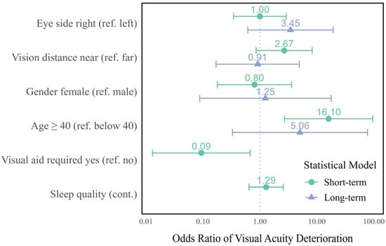 Interval plot of the odds ratios and 95% confidence intervals for deterioration in visual acuity (green: short-term effects, blue: long-term effects; visual aid and sleep quality not included in the long-term model).