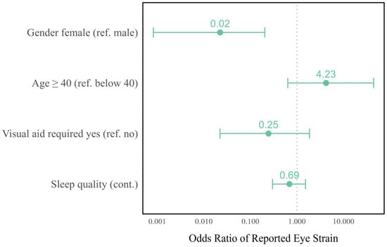 A logistic regression model was used to investigate which parameters influence reported eye strain at the baseline examination. Only participants who answered all five questions on eye strain (glare, afterimages, eye fatigue, burning, or rubbing) were included in the analysis. The dependent variable of the model was whether more than three eye strain symptoms were reported. The model was adjusted for gender, age, sleep quality, and the requirement of a visual aid.