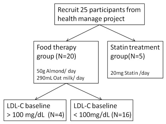 A total of 25 participants provided data for the health management project. As illustrated in Table 1, the two subject groups received disparate interventions to regulate blood lipid levels and cardiovascular risk factors. One group employed a dietary approach, particularly incorporating almonds and oat milk, while the other group utilized statin therapy. The decision-making process for assigning patients to the food therapy or statin treatment group was based on a number of factors, including LDL-C levels (>130 mg/dL) and the patients’ willingness to take medication. Twenty participants were assigned to the therapeutic food therapy group, with a baseline ApoB value of 91.56 ± 26.49 mg/dL. The baseline HDL-C value was 59.60 ± 19.58 mg/dL. The baseline of LDL-C value was 135.9 ± 39.38 mg/dL. The baseline sdLDL value was 38.85 ± 23.42 mg/dL. The baseline hsCRP value was 0.34 ± 0.40 mg/dL. The baseline Lp(a) value was 33.08 ± 42.47 mg/dL. The remaining five participants were assigned to the statin group, with baseline ApoB values of 85.83 ± 13.82 mg/dL, baseline HDL-C values of 46.80 ± 6.87 mg/dL, and baseline LDL-C values of 167.8 ± 45.60 mg/dL. The baseline concentration of sdLDL was 63.76 ± 21.85 mg/dL, while the baseline concentration of hsCRP was 0.16 ± 0.20 mg/dL. The baseline concentration of Lp(a) was 20.47 ± 23.05 mg/dL.