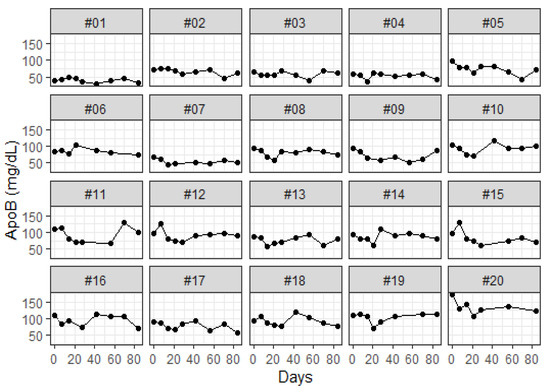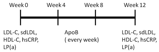 To ascertain the impact of food therapy on the reduction of cardiovascular disease risk at varying baseline levels of ApoB, the food therapy group was subdivided into an ApoB high-baseline group (>100 mg/dL) and an ApoB low-baseline group (<100 mg/dL). In comparison to the baseline levels at week 0 (81.82 ± 17.85 mg/dL), the low-ApoB-baseline group exhibited significantly reduced ApoB levels at week 4 (71.72 ± 20.07 mg/dL, p < 0.05) and week 12 (67.43 ± 16.07 mg/dL, p < 0.01) (Figure 10). The high-ApoB-baseline group exhibited a significant reduction at week 4 (85.79 ± 23.90 mg/dL, p < 0.001) and week 0 (120.75 ± 28.22 mg/dL). Nevertheless, no significant difference was observed between week 12 (101.79 ± 19.95 mg/dL, p = 0.0656) and week 0 (120.75 ± 28.22 mg/dL).