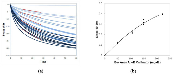 Figure 5a illustrates the slope (red line) of the real-time phase change curves for varying concentrations of the ApoB standards. The slope facilitates the quantitative detection of ApoB from 0 to 212 mg/dL at 10 to 30 s. The standard curve is calculated from these slopes using four-parameter logistics (4PL). To create the standard curve, these slope signals from different concentrations of the calibrant are fitted to the following 4PL equation: