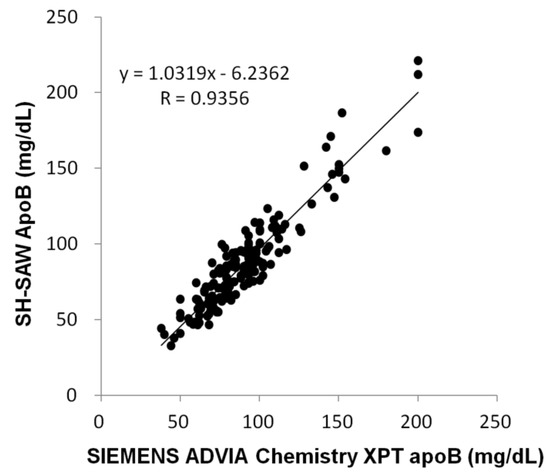 The limit of blank (LoB) (5.47 mg/dL) and limit of detection (LoD) (8.01 mg/dL) were determined by calculating the standard deviation and coefficient of variation from 60 replicate tests at low concentrations [18]. Within-run repeatability and between-run repeatability precision coefficients of variation (CV) were less than 10% at ApoB concentrations between 42 and 120 mg/dL. A comparison study was conducted using a commercially available ApoB detection kit with all 154 whole blood samples. The slope of the comparison of measurement (1.0319) and the correlation coefficient (R, 0.9356) suggest a high degree of agreement between the two test methods (Figure 6).