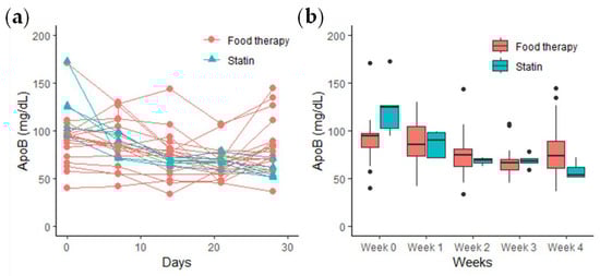 Comparison of ApoB-lowering effects in the food therapy group versus the statin treatment group: (a) line chart; (b) box plot.