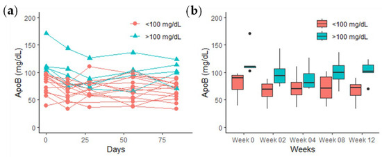 Comparison of the effect of food therapy group in reducing the high-ApoB-baseline (>100 mg/dL) and the low-ApoB-baseline (<100 mg/dL) groups: (a) line chart; (b) box plot.