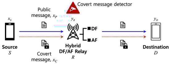 Figure 1 illustrates our considered hybrid DF/AF relay system with an embedded covert message detector. The source node S secretly transmits covert messages to the destination node D under cover of public messages. The relay R in normal operation forwards messages in either DF or AF mode based on the request from the source node. We assume that the S-D direct link is unusable due to shadowing or a far distance [14].