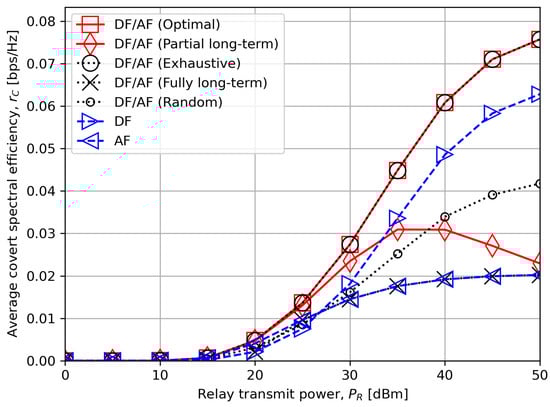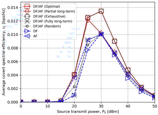 Figure 3 shows the average worst-case covert rate as a function of the source transmit power . We observe that the optimal mode selection of the hybrid DF/AF relay (“DF/AF (Optimal)”) yields a significant performance gain over the single relay modes (“DF” and “AF”). The equivalence between “DF/AF (Optimal)” and “DF/AF (Exhaustive)” in which the best relay mode is selected after evaluating all the logarithms in (18) and (19), (27)–(29) also verifies the correctness of our proposed criterion. The performance gain of the optimal criterion over the other compared schemes is approximately 35% at dBm.
